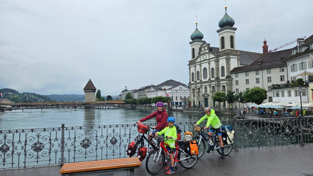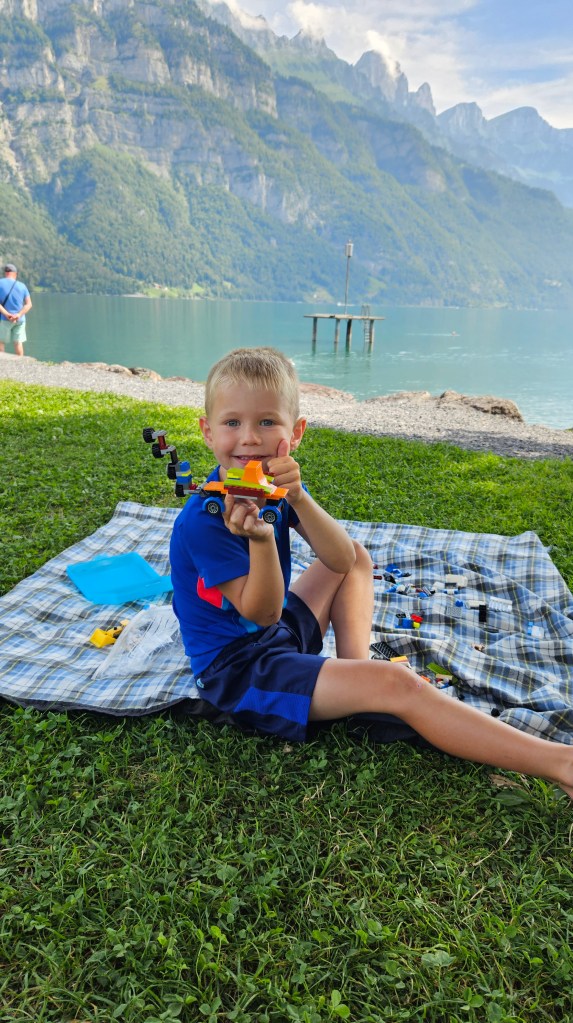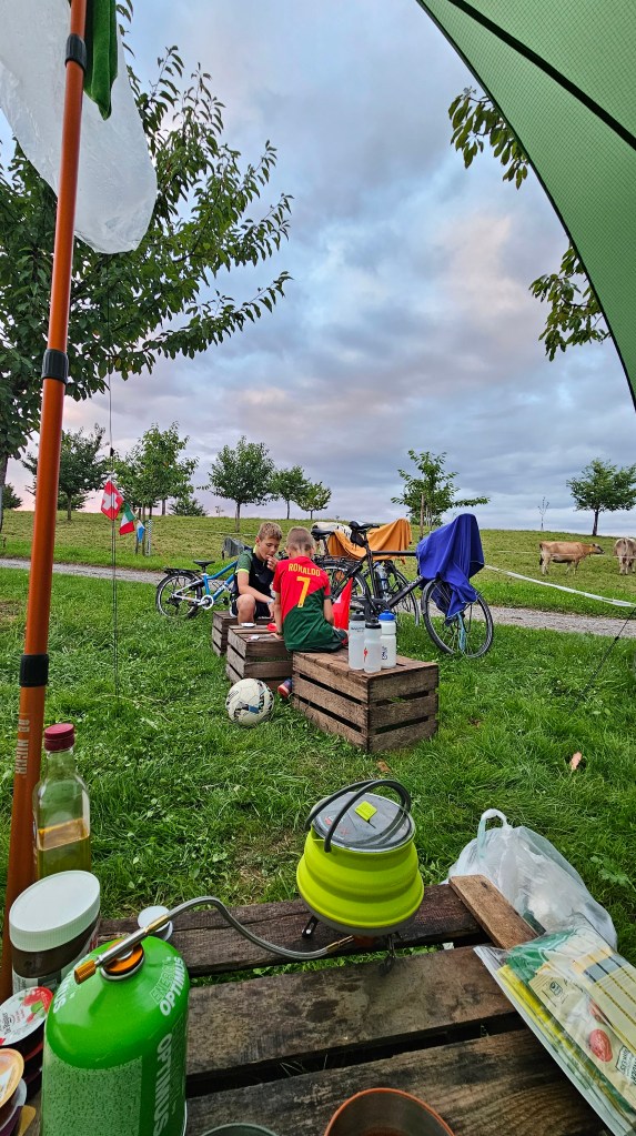 We fietsten eerst nog een stukje door Luzern, om vervolgens via boerenland, bossen en leuke dorpjes (stop bij de bakkerij!) naar Cham te rijden. Daar is een boerderijcamping met een boerderijwinkel voor verse groenten en fruit, waar we letterlijk in een weiland kampeerden. Toilet en douche waren in de ‘Eventraum’ en dat was prima. Verder weinig vertier, we waren de enige gasten, maar de kinderen vermaakten zich uitstekend. Die middag reden we 2 kilometer terug naar het zwembad van Cham, want ook daar wilden we een duik nemen – inclusief hoge duikplank, dus extra punten voor dit meer!