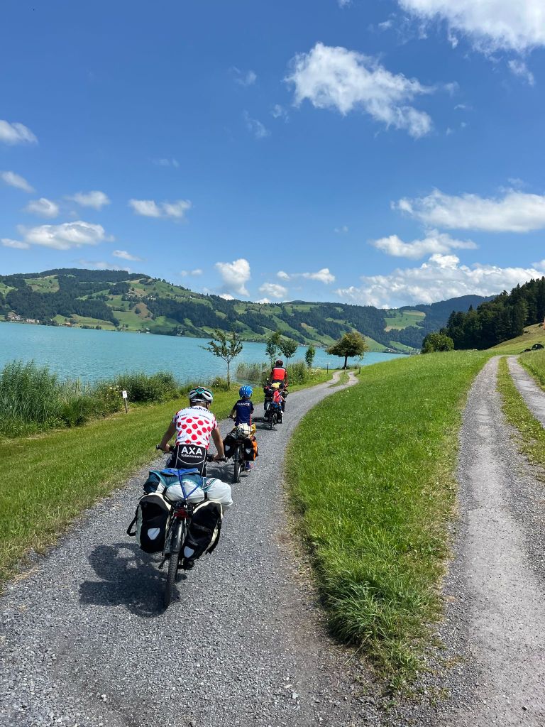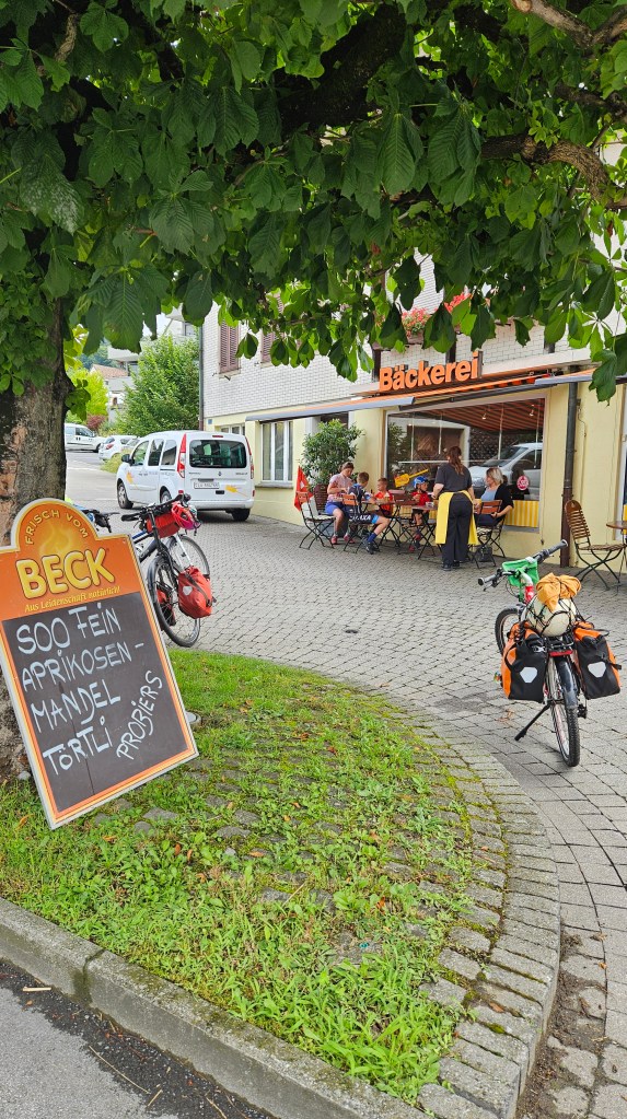 In Cham haalden we vers brood bij de bakker en ontbijtten aan het meer, met zonnetje en prachtig uitzicht. We fietsten nog een stuk langs het meer en staken bij Zug links af langs een rivier op weg naar Unterägeri. We kregen een pittige klim (gravel fietspad), maar kwamen allemaal boven. Het was heerlijk afdalen naar Unterägeri. Daar liggen drie campings, iets buiten het dorp, waar we even inkopen deden.