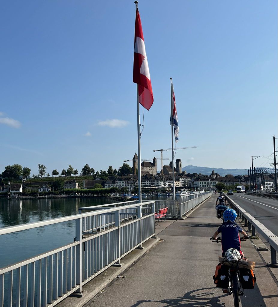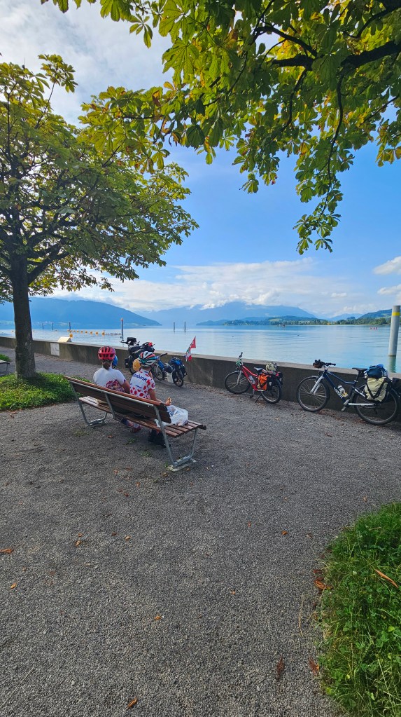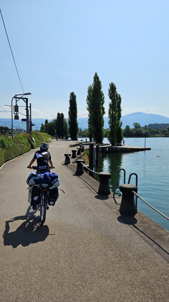 Na een lekker ontbijt daalden we af naar Pfäffikon en fietsten via de ‘Seedamm’ langs de Obersee. Daar vonden we een mooie picknickplek, en omdat we gisteren niet hadden gezwommen, trokken we hier onze zwemkleren aan. Een half uur later vertrokken we weer – heerlijk zo’n frisse duik!