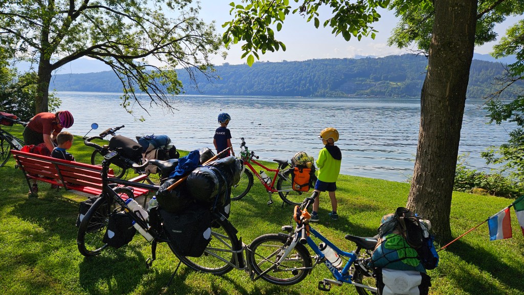 We fietsten langs het prachtige meer, het was nog lekker koel. De dag zou warm worden, met mooie vergezichten langs de Rijn, op de grens met Liechtenstein, door wijnvelden (af en toe klimmetje). We kwamen aan op een leuke boscamping met een opgezet zwembad. We kampeerden op speciale fietskampeerdersplekken. De omgeving was ideaal voor wandelingen, en op de camping was genoeg te doen voor kinderen, met spelletjes zoals darten.