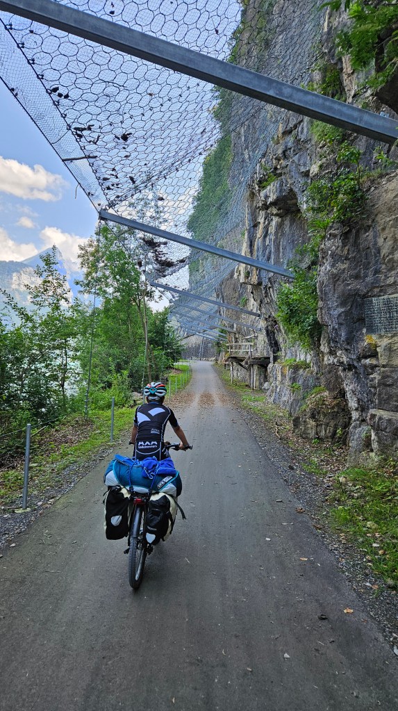 Vandaag fietsten we naar de Walensee, door afwisselend landschap, veel rechte fietspaden en aan het eind een pittig, kort klimmetje ‘bovenlangs’. De autoweg liep links van ons. In Murg is een mooie camping direct aan het meer. Het trekkersveldje was vol, dus stonden we bij de tennis- en volleybalvelden (tip: reserveren vooraf). We bleven hier twee dagen, omdat het meer zo heerlijk was, de camping leuk, en we een korte wandeling maakten naar een waterval. Ook namen we de trein terug vanaf station Murg. Er is een kleine supermarkt voor inkopen.