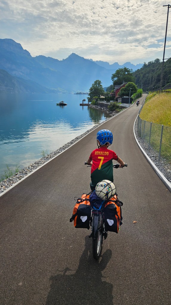 Vervolgens fietsten we via een mooi pad langs het Ägerisee. De eerste camping had een groot trekkersveld aan de voorkant, maar voelde niet helemaal goed. We fietsten door naar de volgende twee campings. Een prachtig pad langs het meer bracht ons naar de kleine camping in Nas. Links lag het trekkersveldje en onderaan het meer. Geen twijfel: hier wilden we overnachten. Er waren diverse kinderen om mee te voetballen. Een klein winkeltje verkocht ijsjes en snoep, maar helaas toen geen groenten of fruit.