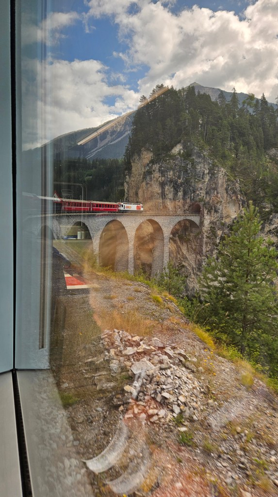 De treinreis was prachtig, met het Landwasser-viaduct, tunnels, haarspeldbochten en steeds hoger de bergen in. Twee uur vlogen voorbij. In Samedan (ruim 1800 meter hoog) stapten we uit en voelden direct de frisse berglucht.