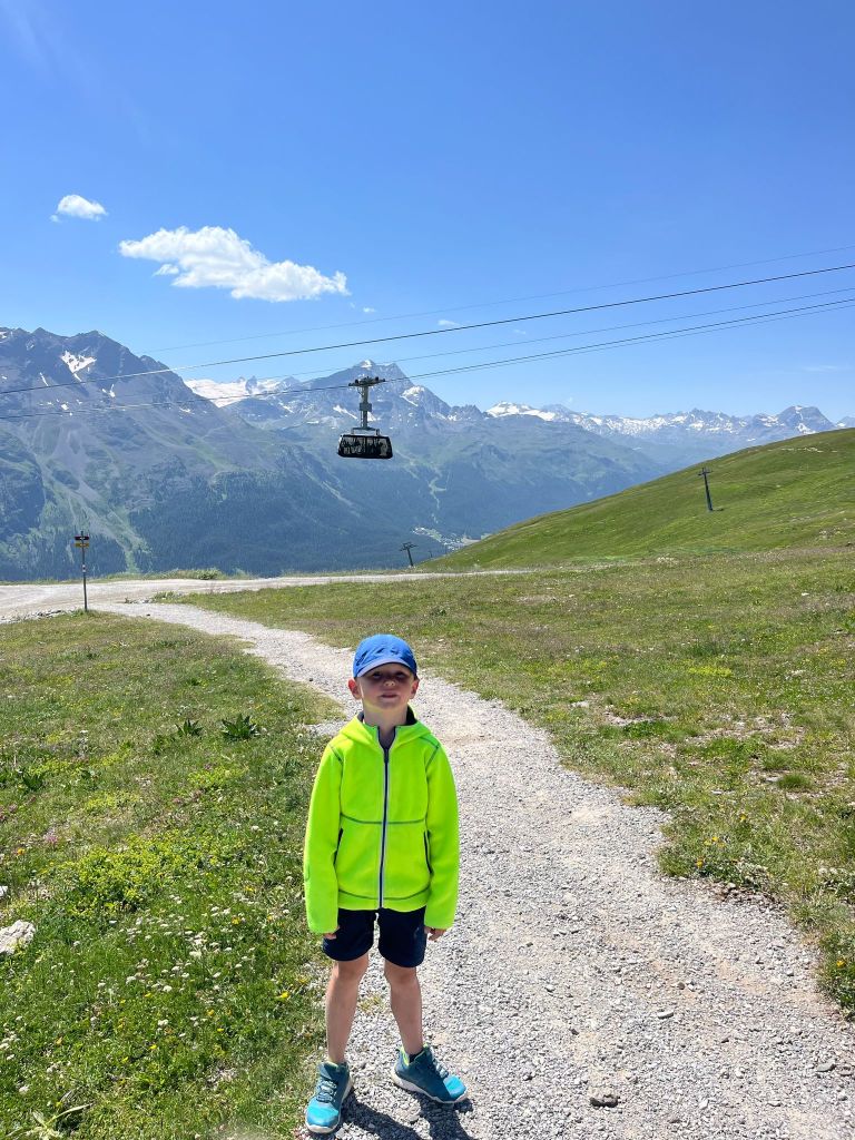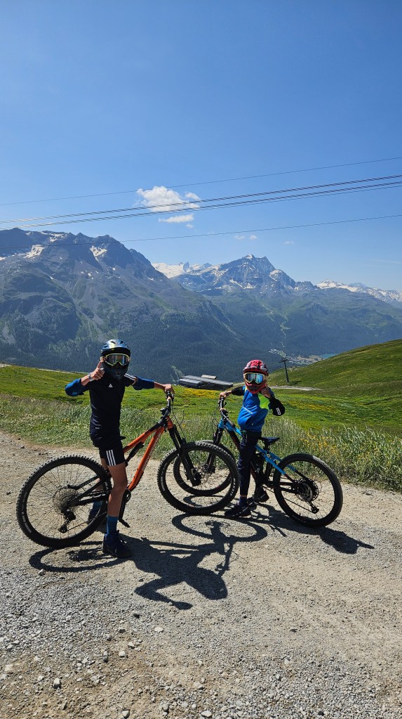De jongens wilden graag downhillen, dus gingen we naar Sankt Moritz. Niet goedkoop, zeker met liftpassen erbij, maar wat een fantastisch gebied met makkelijke en uitdagende trails. De jongens vermaakten zich de hele dag, terwijl Karin met Aron wandelde naar een bergmeer met uitzicht op vierduizenders.