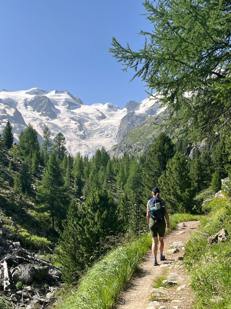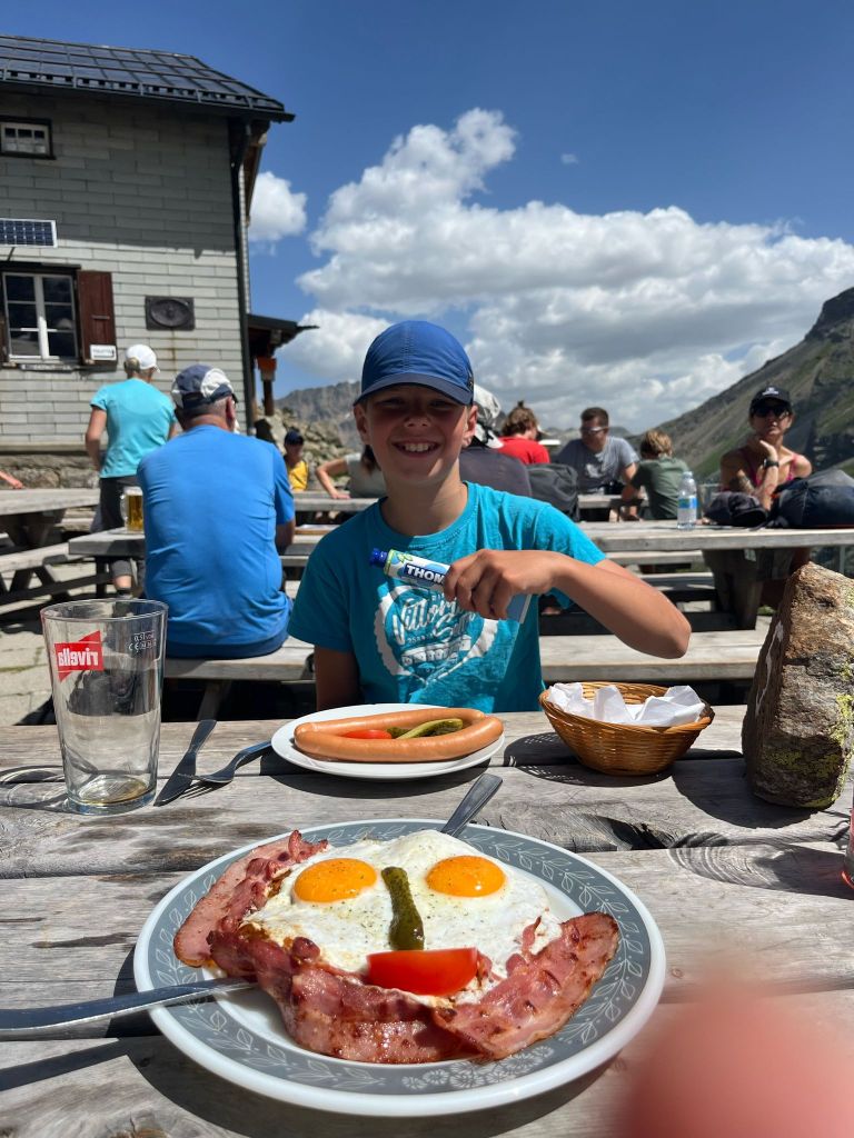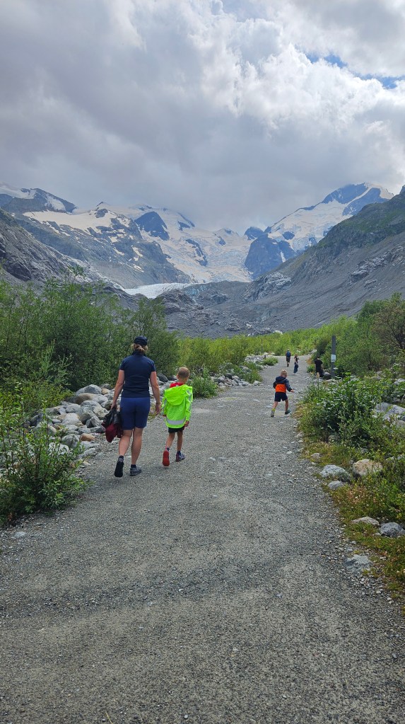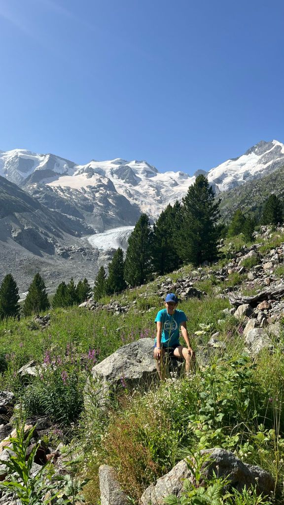 De volgende dag wandelde Karin met Thom (11) naar de Bovalhütte op 2400 meter hoogte, met zicht op de Morteratsch-gletsjer. De wandeling duurde ongeveer drie uur, soms klauteren en steil. In de hut genoten we van rosti en kregen we theewater mee in onze bidons. We begonnen de wandeling vanaf station Morteratsch en namen de trein vanaf Punt Murgal Staz (fiets kan gewoon mee) om wat klimmen te vermijden. Op de terugweg daalden we af op de fiets.