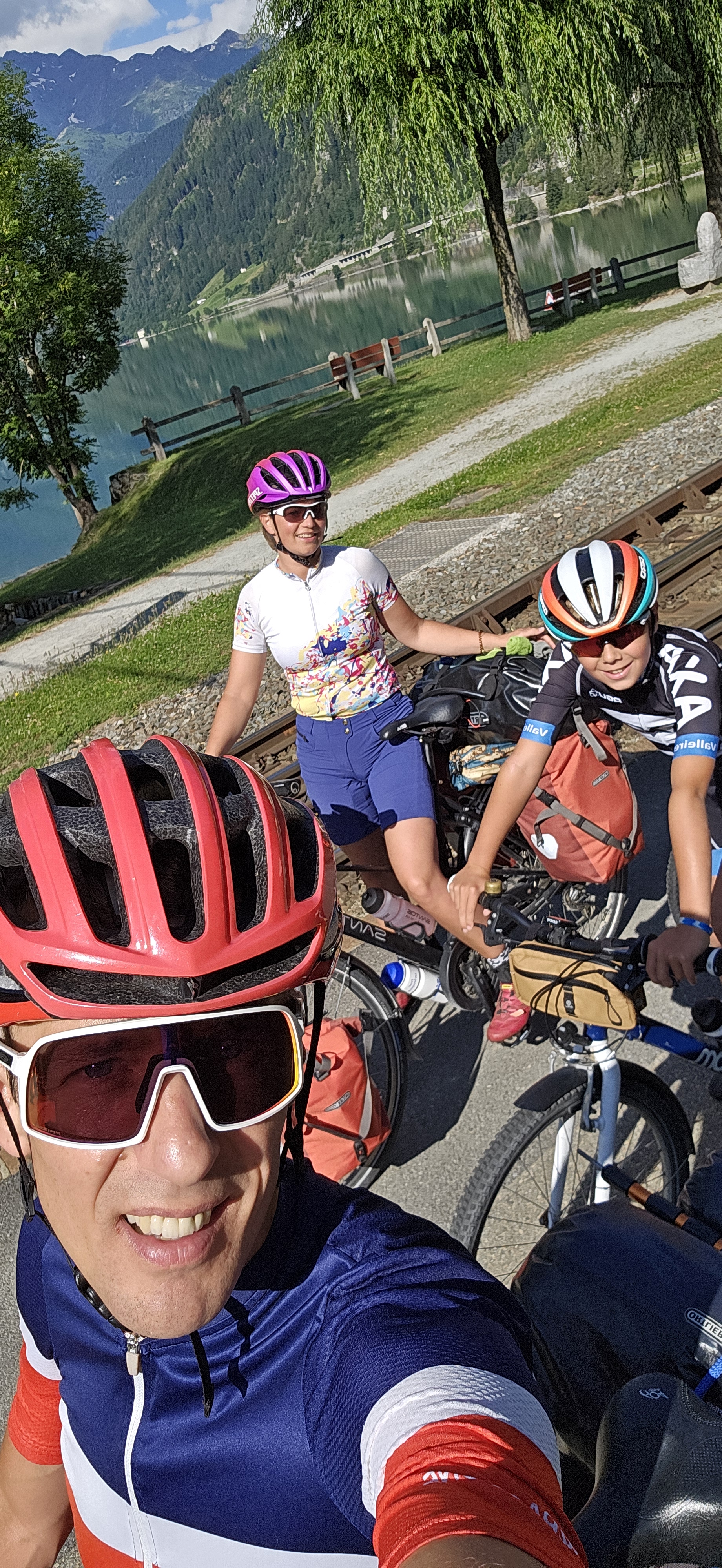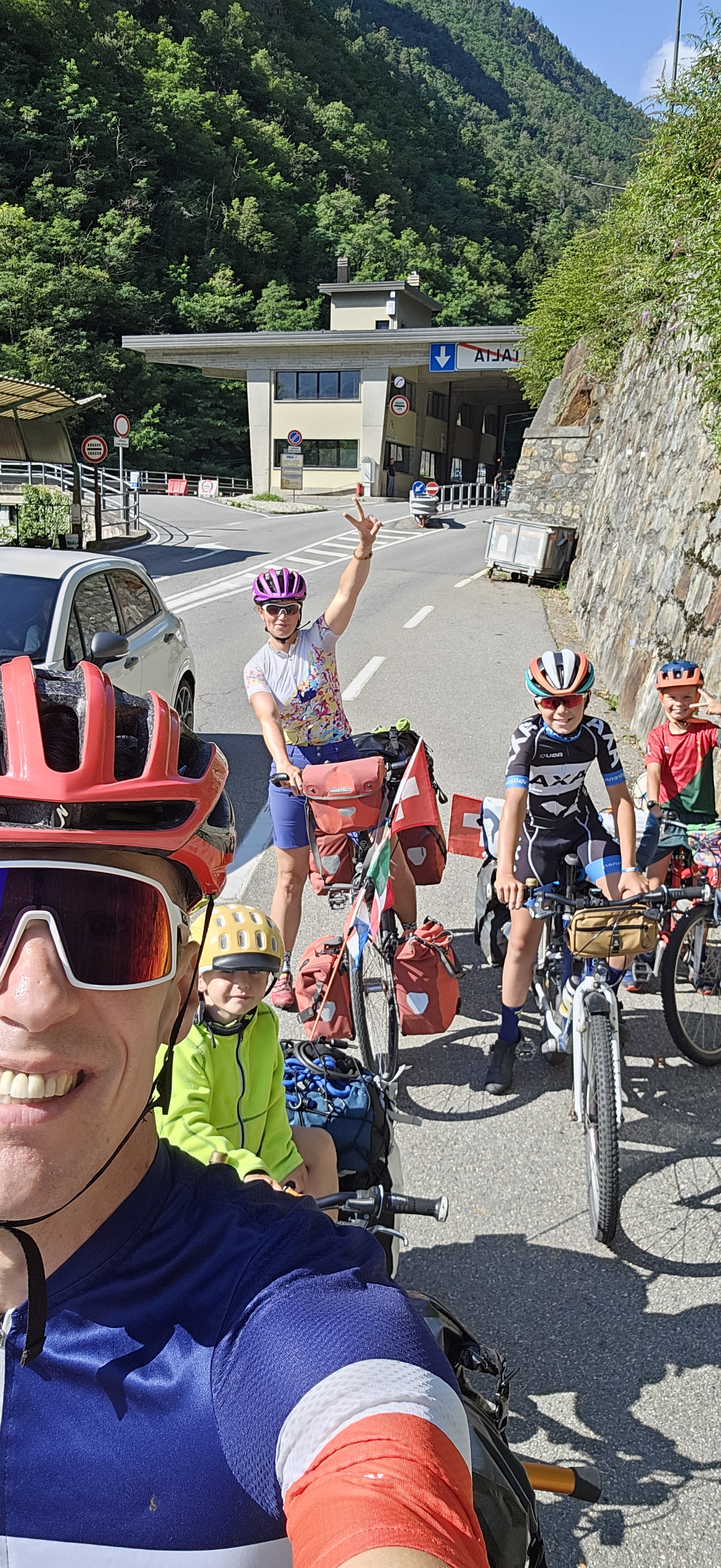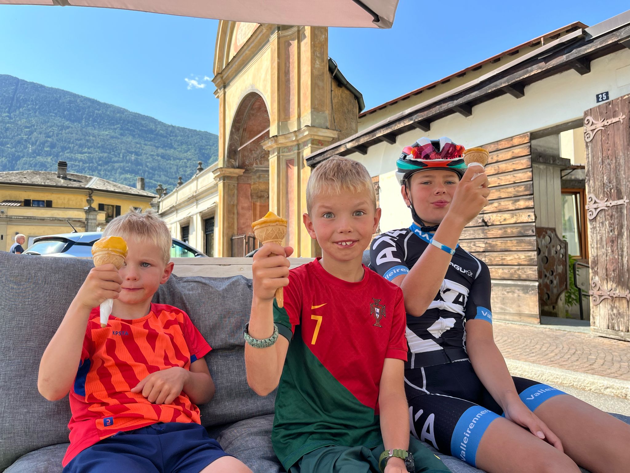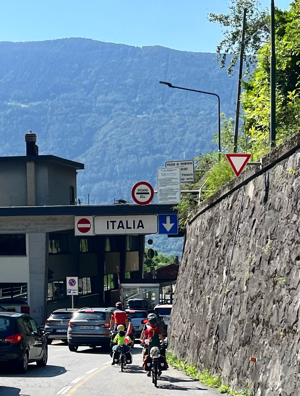 Op deze fietsdag gaan we echt naar Italie. Na de hoge bergen is dit een hele leuke omschakeling. Na nog wat afdalen en de grensovergang komen we in Tirano. Dit is ook meteen het einde van de Bernina Express en we wanen ons echt in Italie. Dus eerst een goede cappuccino (die ook betaalbaar is;-) en Italiaans ijs voor de kids op het plein van de Madonna di Tirano. Niet naar binnen geweest helaas, dat hadden we eigenlijk gewoon moeten doen.
