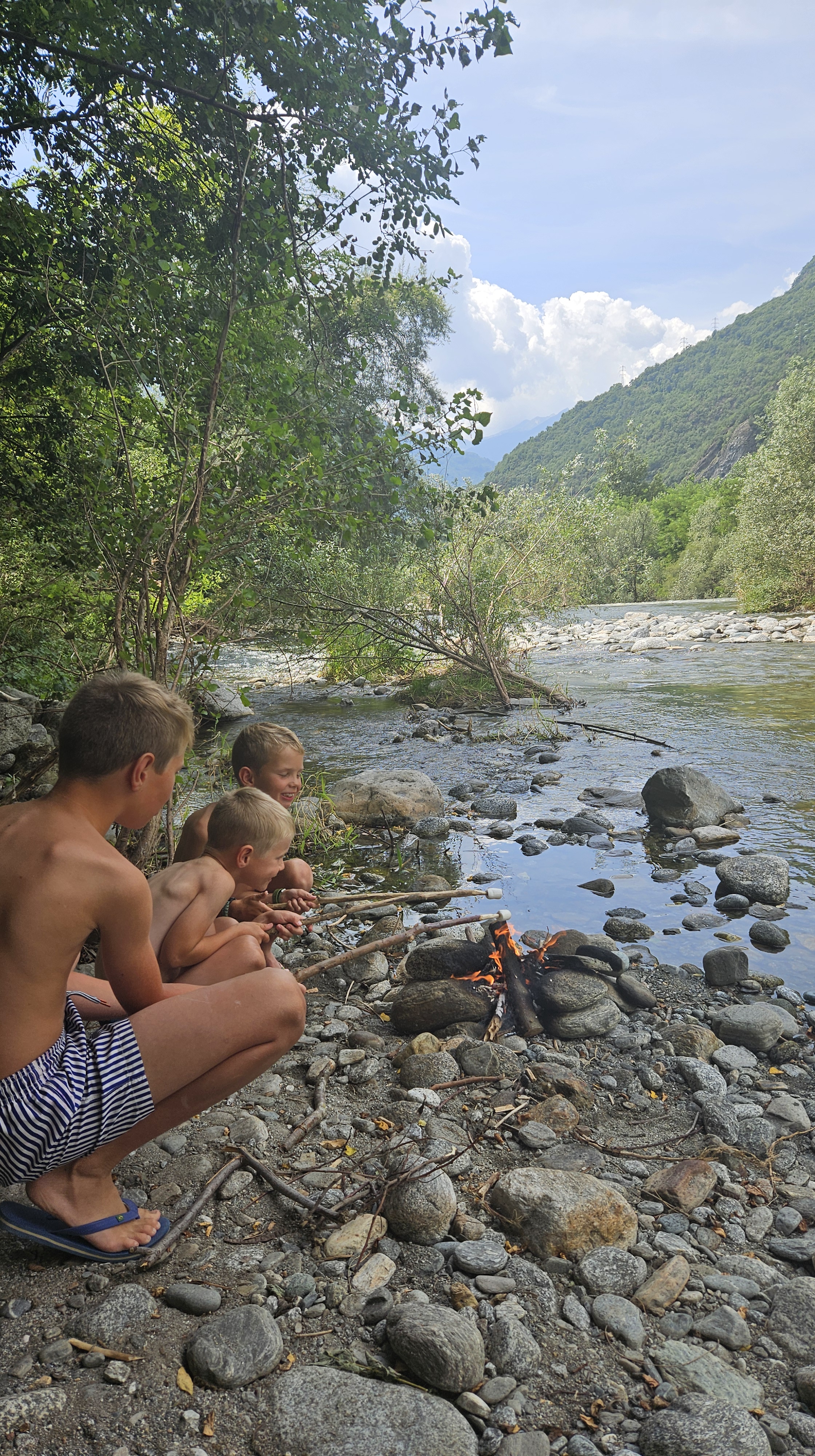 We besluiten een dag langer te blijven en 5 kilometer terug te fietsen. De dag ervoor zagen we een mooi plek bij de rivier waar mensen op een strandje zaten. Dat blijft een goede keus. We blijven de hele dag om lekker te zwemmen, te lezen, dammetjes te bouwen en een dutje te doen. De italianen houden van een goede lunch, dus naast ons werd een vuurtje gestookt. Wij deel van een lunch, wij hadden marsmallows mee.