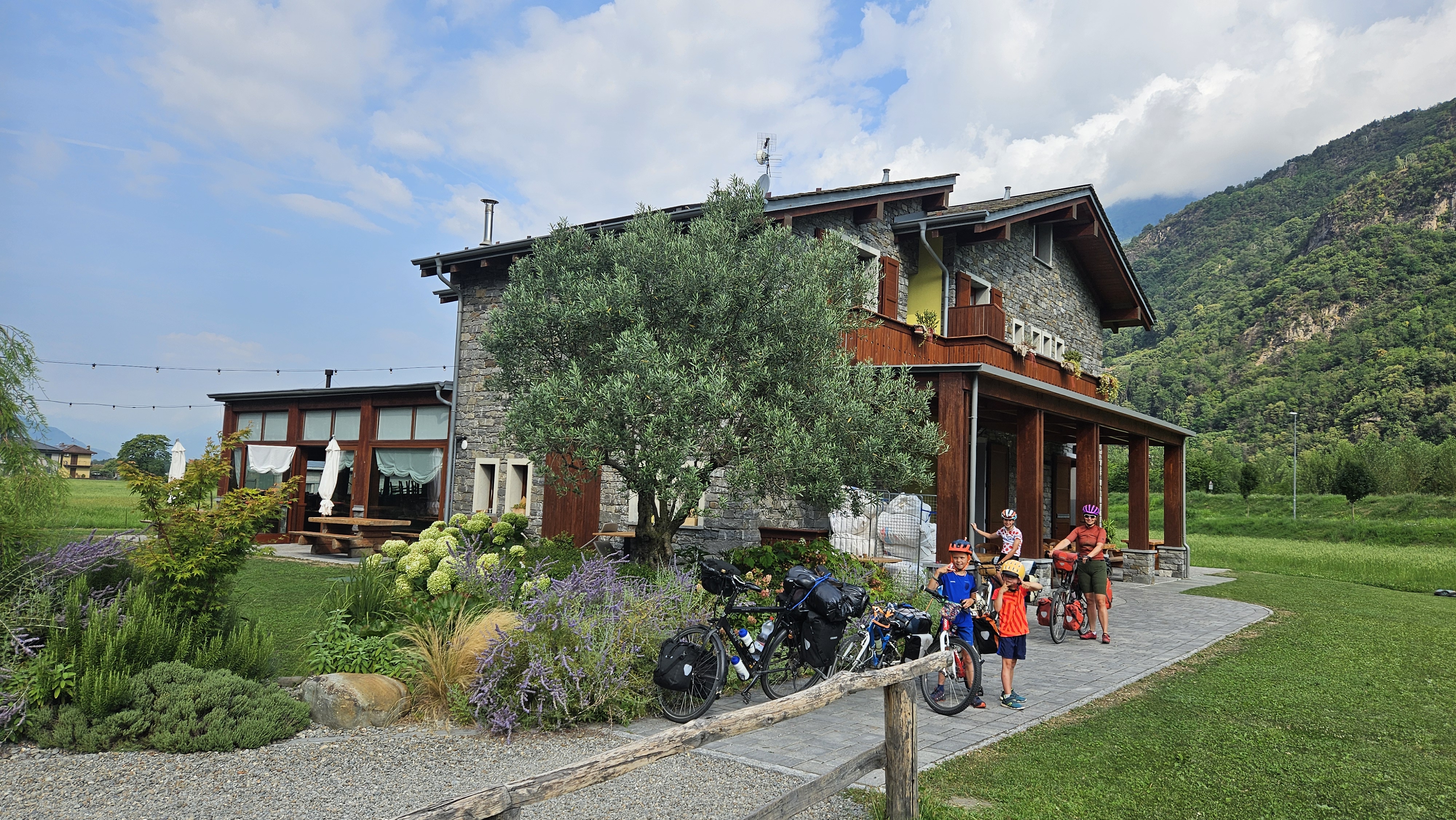 Na de afdaling merkten we dat we in een ander klimaat kwamen: warmer, met palmbomen, Italië! We besloten het Italiaanse ritme aan te nemen met een uitgebreide lunch bij Restaurant Motrice. Daarna fietsten we een paar kilometer naar camping Cavresc, waar reserveren echt nodig is.