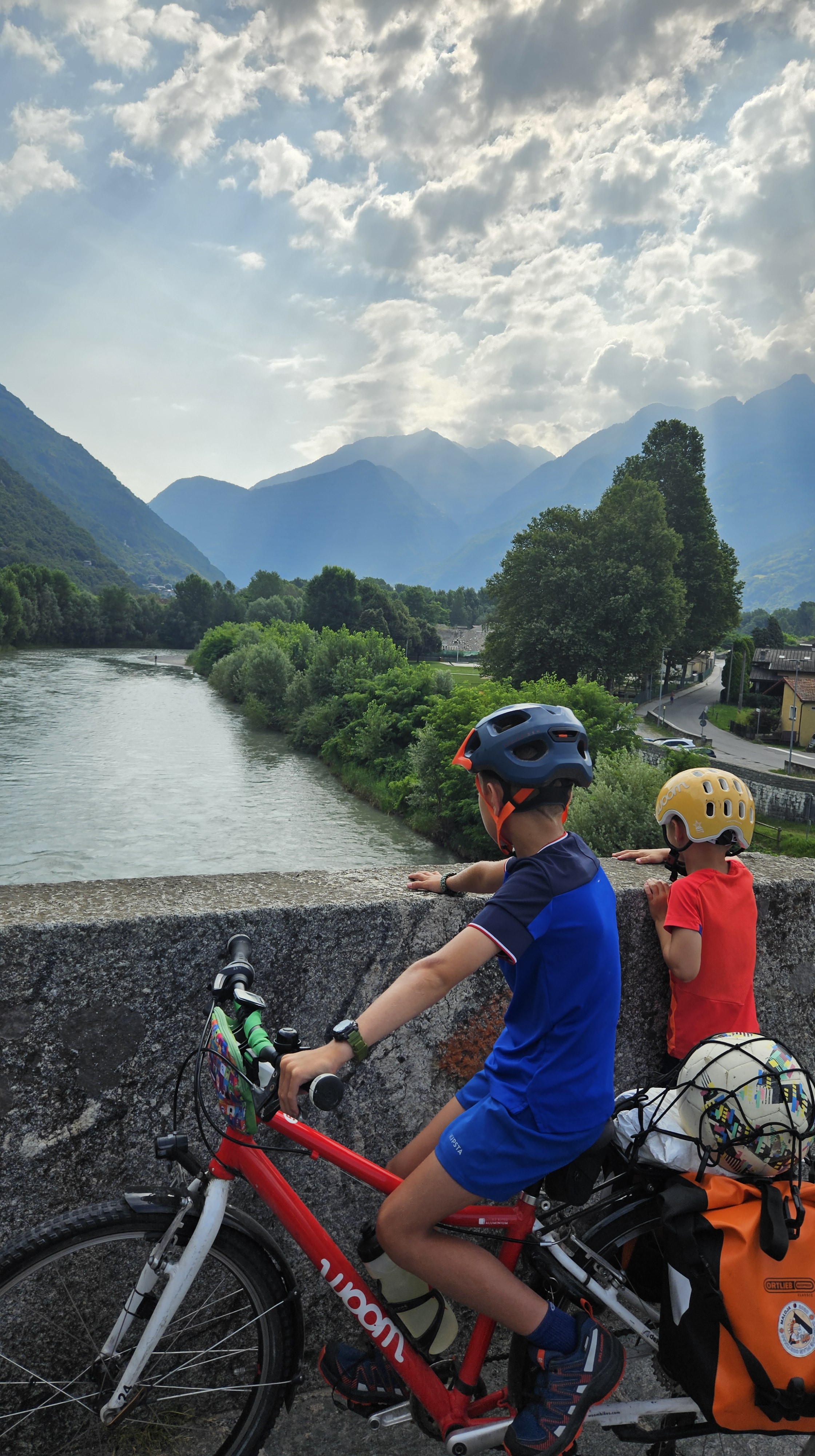 Deze dag heeft flink wat kilometers, weliswaar vlak, lichtdalend door het het Valtellini dal en ook nog bewegwijzerd. Het is recht toe, recht aan, soms wat saai omdat de route juist dorpjes en stadjes ontwijkt. Halverwege zien we kids vanaf een rots in de rivier duiken, dus we parkeren ook onze fietsen voor een frisse duik.