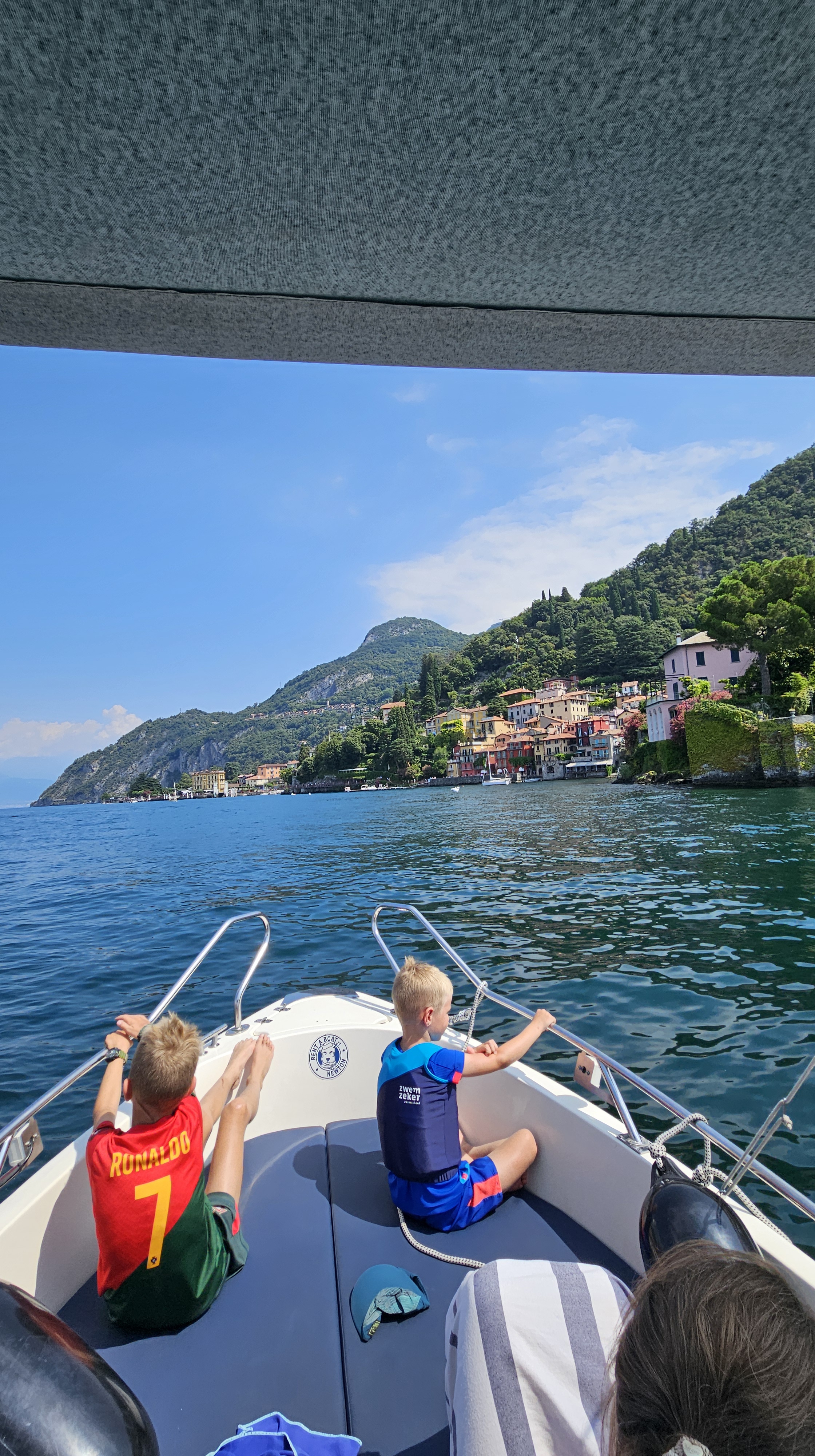 Op 200 meter van de camping is een bootverhuur, dus we besluiten een bootje te huren. De kids vinden het helemaal leuk. Vol gas natuurlijk en af en toe ook even zelf sturen. We zien de mooie delen van het Comomeer en duiken twee keer gewoon het water in, heerlijk. Na 4 uur rond het Comomeer varen we weer terug. Dat was een belevenis. Savonds eten we bij een pizzarestaurant in de buurt. Italiaanse prijzen zijn toch wat leuker dan de Zwitserse.