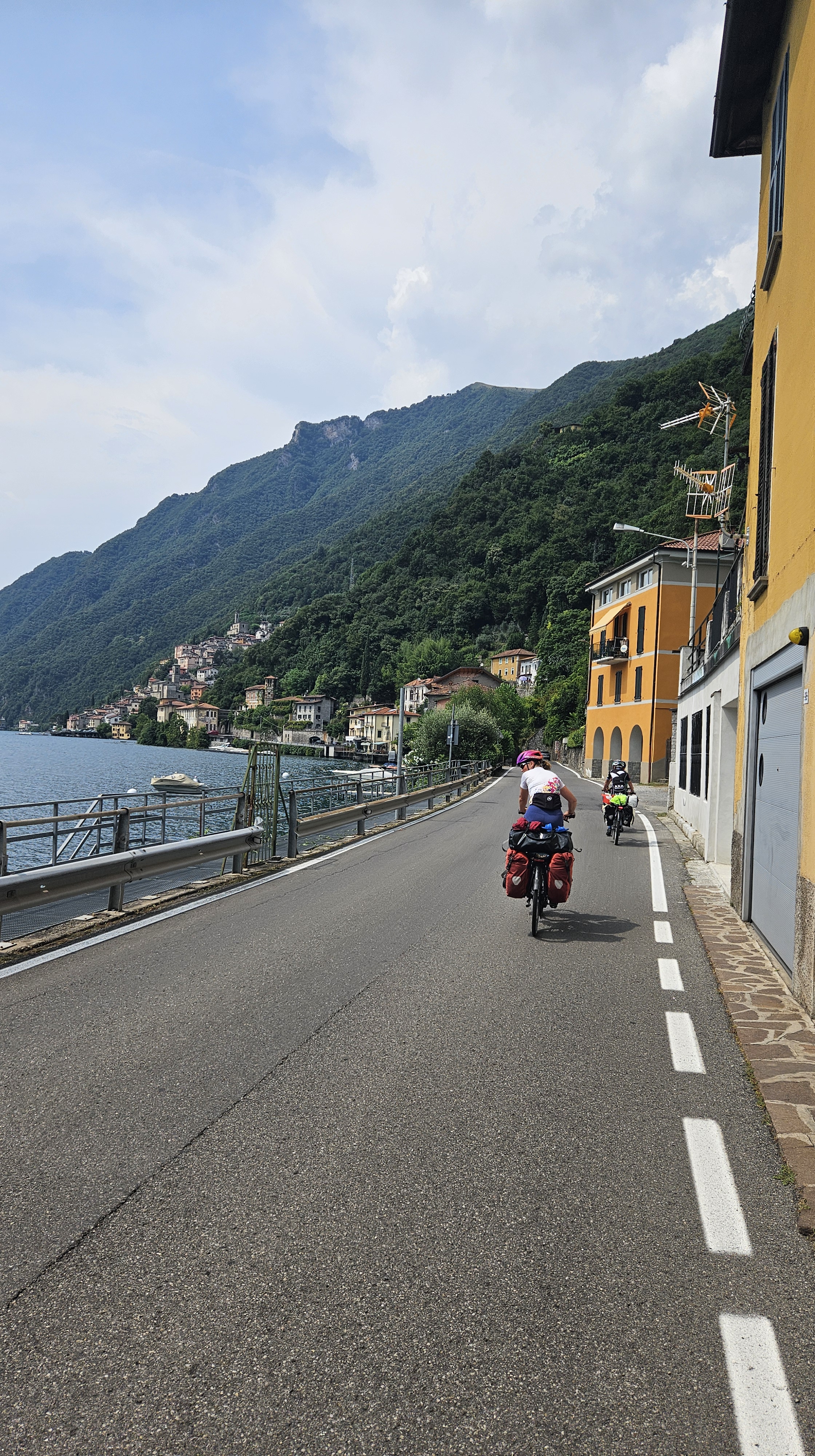 Vandaag fietsen we verder het Valtellina dal uit naar het Comomeer! Hier is het echt druk, veel vakantiegangers. We fietsen eerst nog langs een fietspad, maar dat is bijna niet te doen. We besluiten om langs de drukke, doorgaande weg te fietsen. Lampjes aan en gaan. Na 10 kilometer komen we in de buurt van Dong op onze camping. Camping Ideal. Een straatje met aan beide kanten stacaravan en plek voor tenten, aan het einde van het straatje zie je het Comomeer al liggen. Even wennen op zo’n camping met wat verouderd sanitair, maar het heeft wel iets gezelligs. Er is een barretje met goede koffie en we kunnen gewoon gebruik maken van hun koelkast en vriesvak.